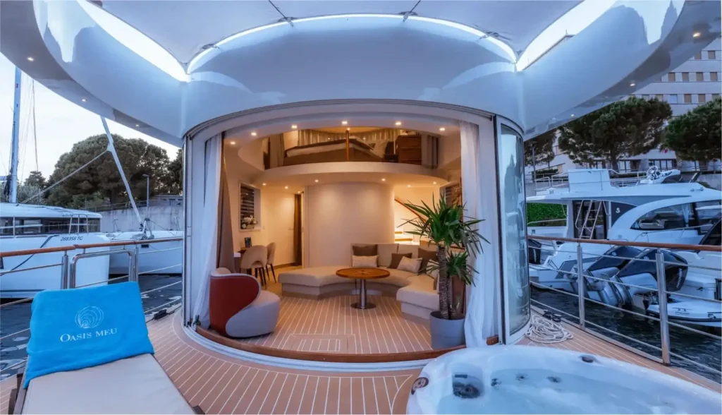 ”Naturen har alltid varit en oändlig källa till inspiration och har väglett oss i varje steg när vi skapat en ny livsstil. Det är filosofin bakom Oasis Meu – en övertygelse om att naturens magnetiska kraft ska återspeglas i varje detalj av våra flytande hem.” skriver Oasis Meu.
